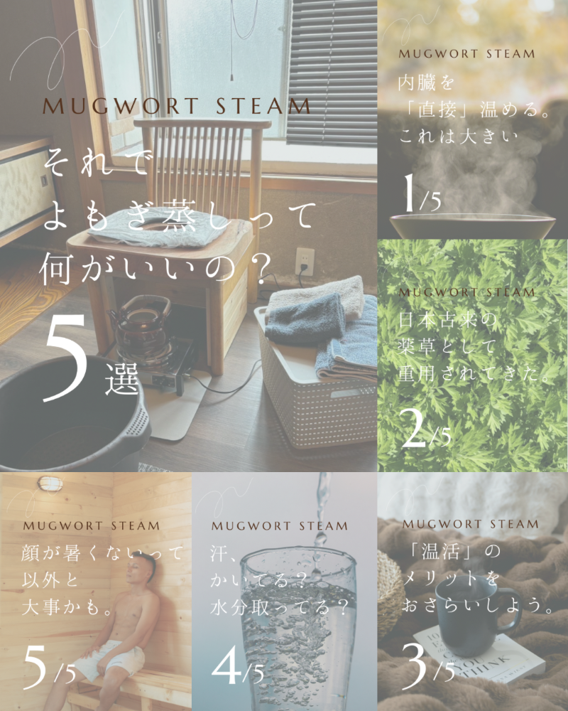 内容:専用のマントをきていただき、その中でオーガニックのよもぎとその他バーブをブレンドしたもので蒸します。はじめの10分は同時に足湯にもつかっていただいて、たっぷりと汗をかいてもらいます。